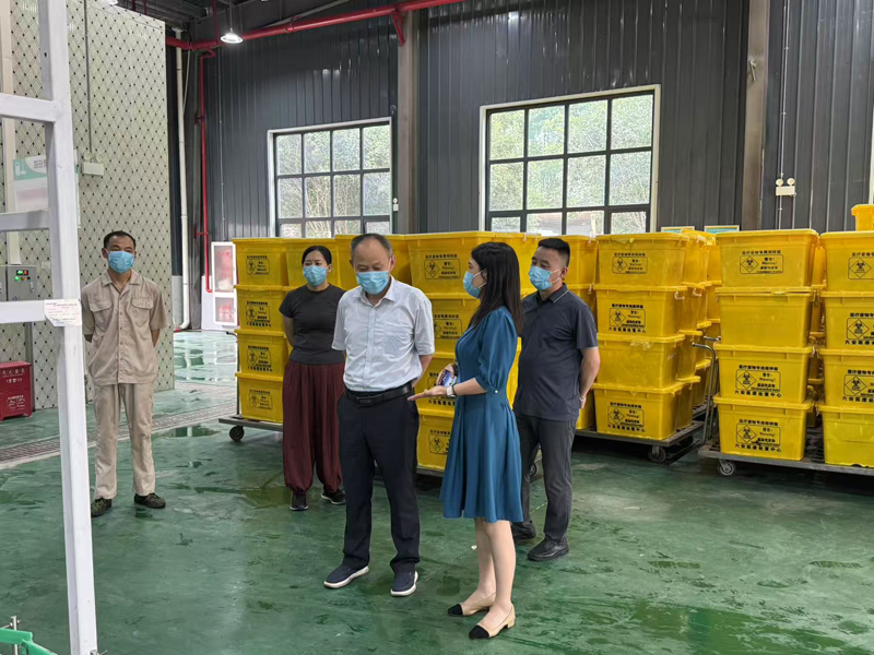 韩主任一行深入生产一线,先后参观了生产处置车间、冷库、污水处理设备等区域。洁康公司负责人详细介绍了医疗废物从分类收集、运输,到高温蒸煮、破碎的全过程处置流程。通过实地参观,领导们对洁康公司医疗废物收集、运输、处置的全过程管理有了全面深入的了解,对洁康公司在生产自动化设备技术改造方面取得的成效给予充分肯定。