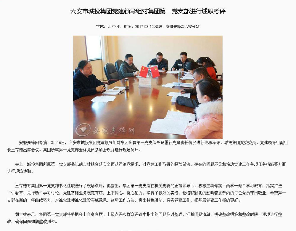 【安徽先锋网】六安市城投集团党建领导组对集团第一党支部进行述职考评