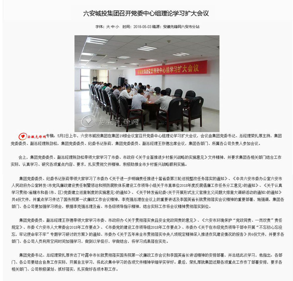 【安徽先锋网】六安城投集团召开党委中心组理论学习扩大会议