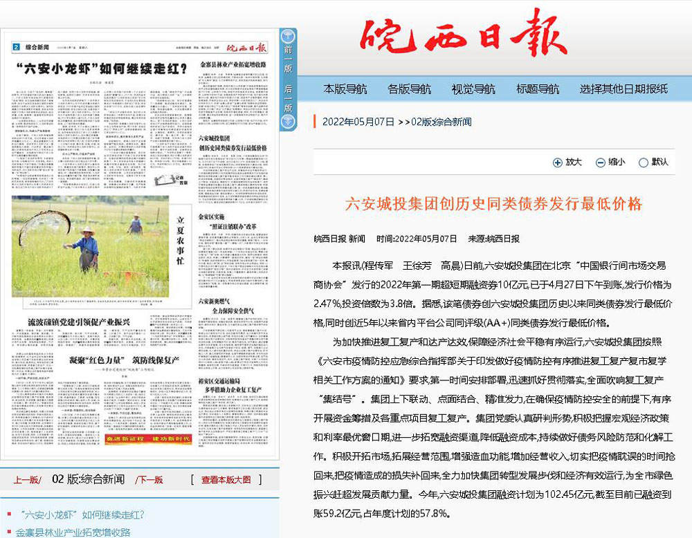【皖西日报】六安城投集团创历史同类债券发行最低价格