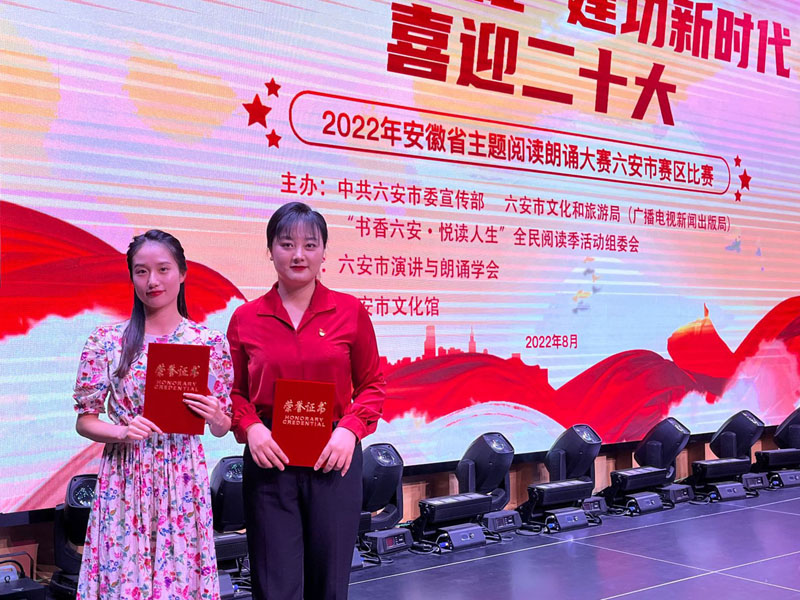 8月29日,由市委宣传部、市文旅局(广播电视新闻出版局)和“书香六安 悦读人生”全民阅读季活动组委会主办的“奋进新征程 建功新时代 喜迎二十大”2022年安徽省主题朗诵阅读大赛六安市赛区决赛在市文化馆举行,集团石宝山陵园公司党支部党员韩丽君荣获二等奖,集团国资公司党支部党员侯纪荣获三等奖。